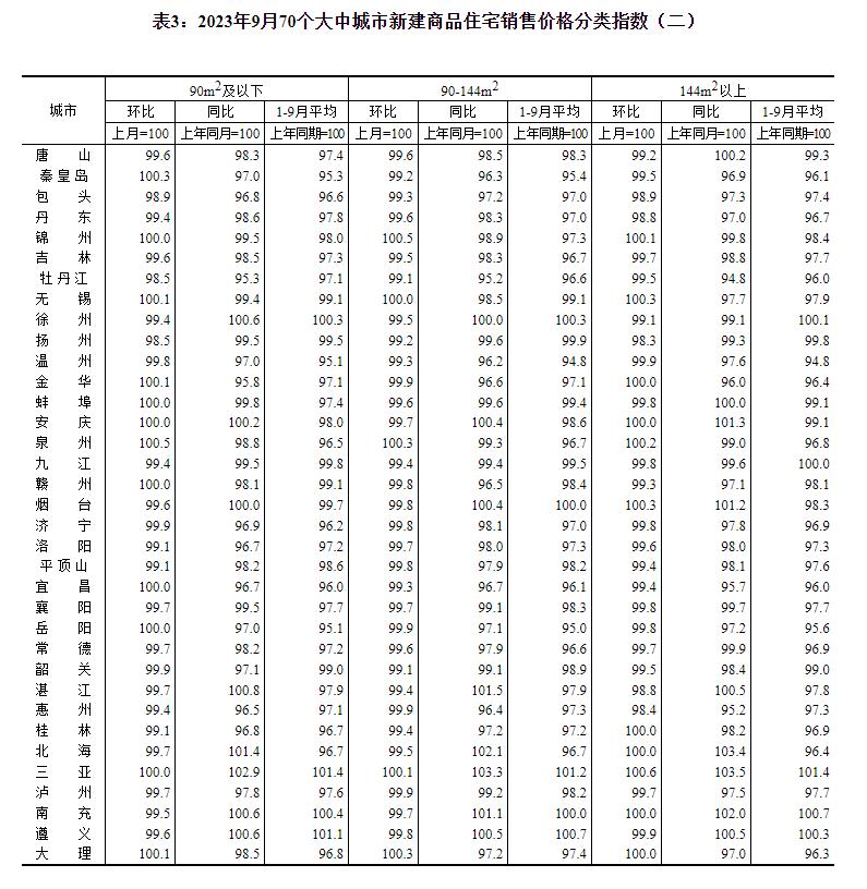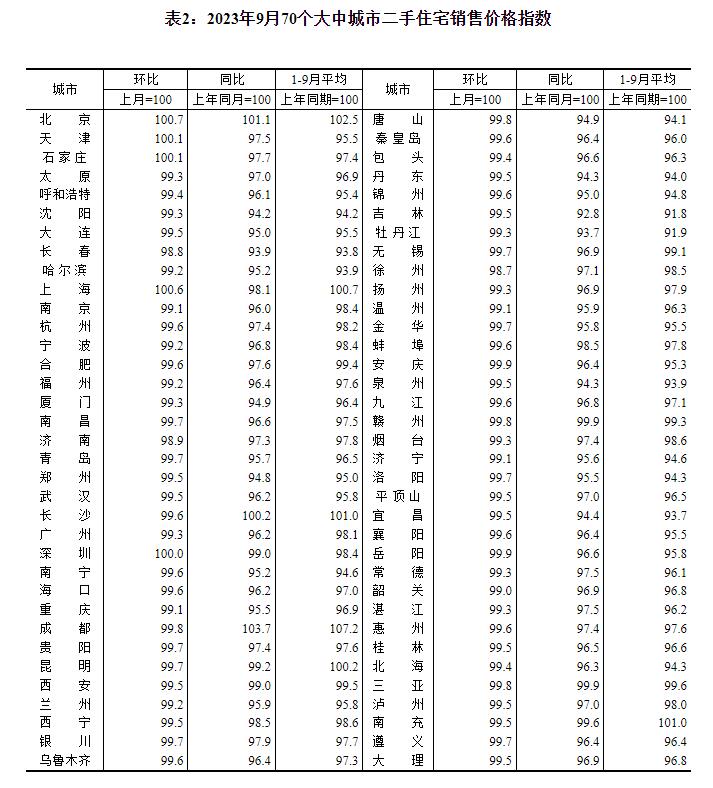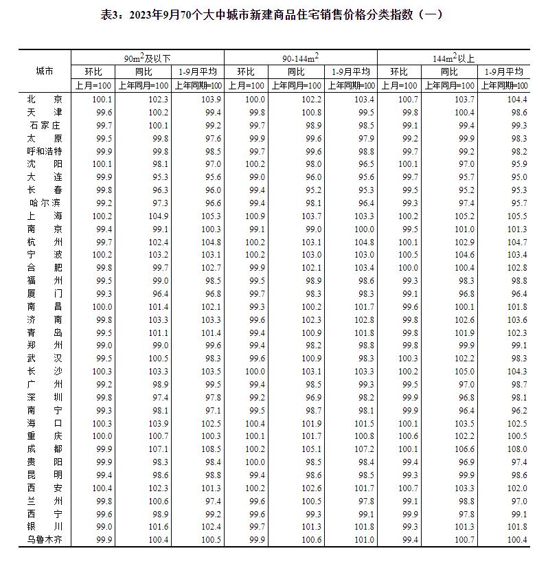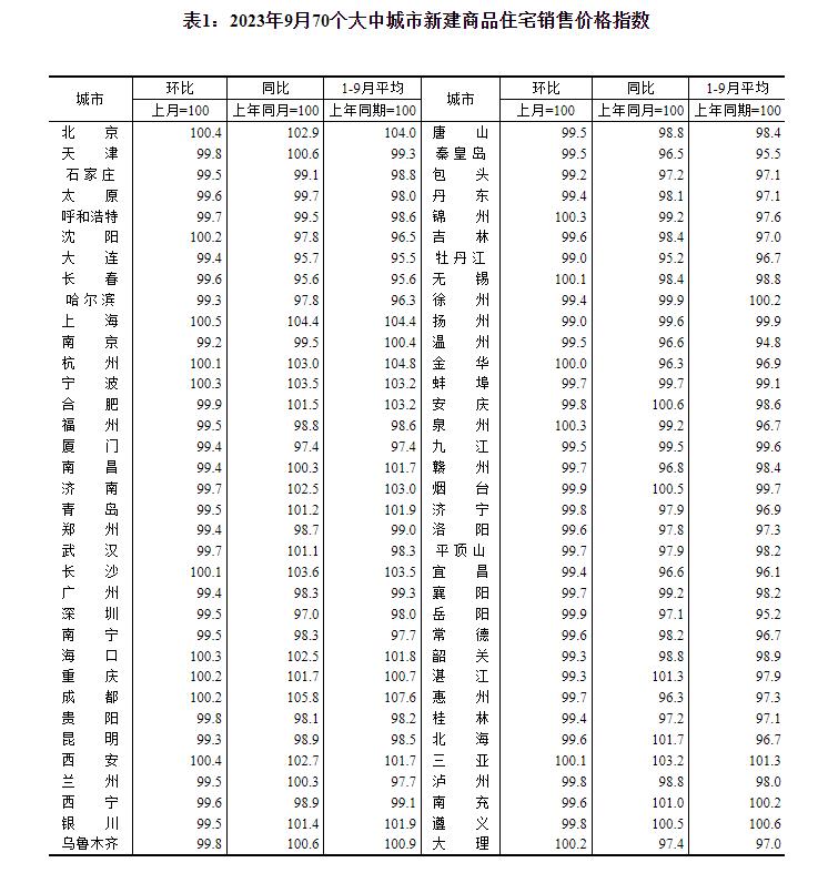 2023年9月份70个大中城市商品住宅销售价格变动情况