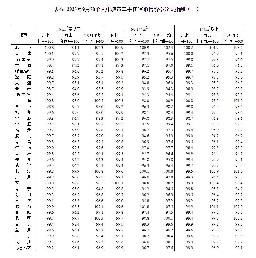 从同比看,9月份,二线城市新建商品住宅销售价格同比上涨0.2%,涨幅比上月回落0.1个百分点;二手住宅同比下降3.2%,降幅比上月扩大0.2个百分点。三线城市新建商品住宅和二手住宅销售价格同比分别下降1.4%和3.5%,降幅均与上月相同。